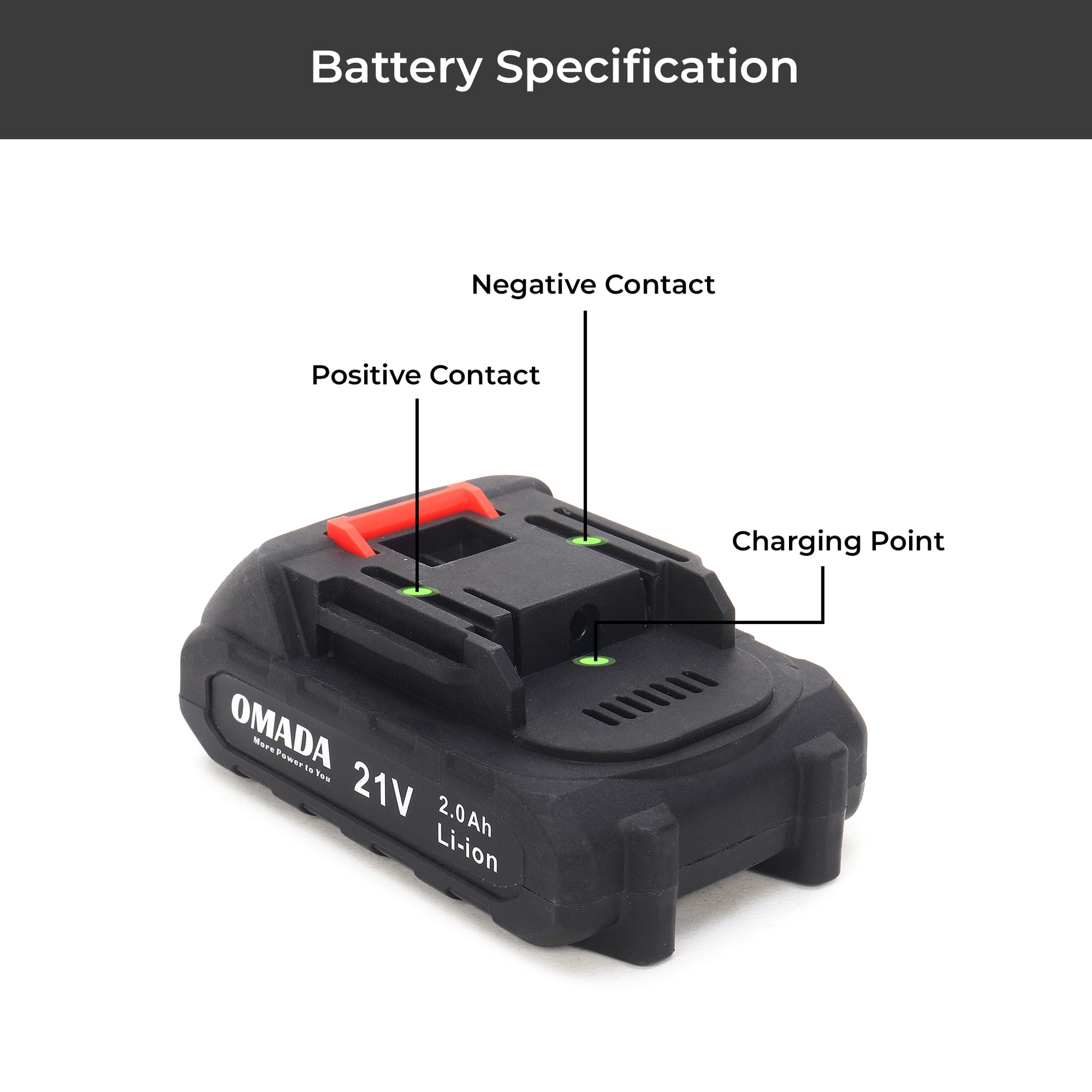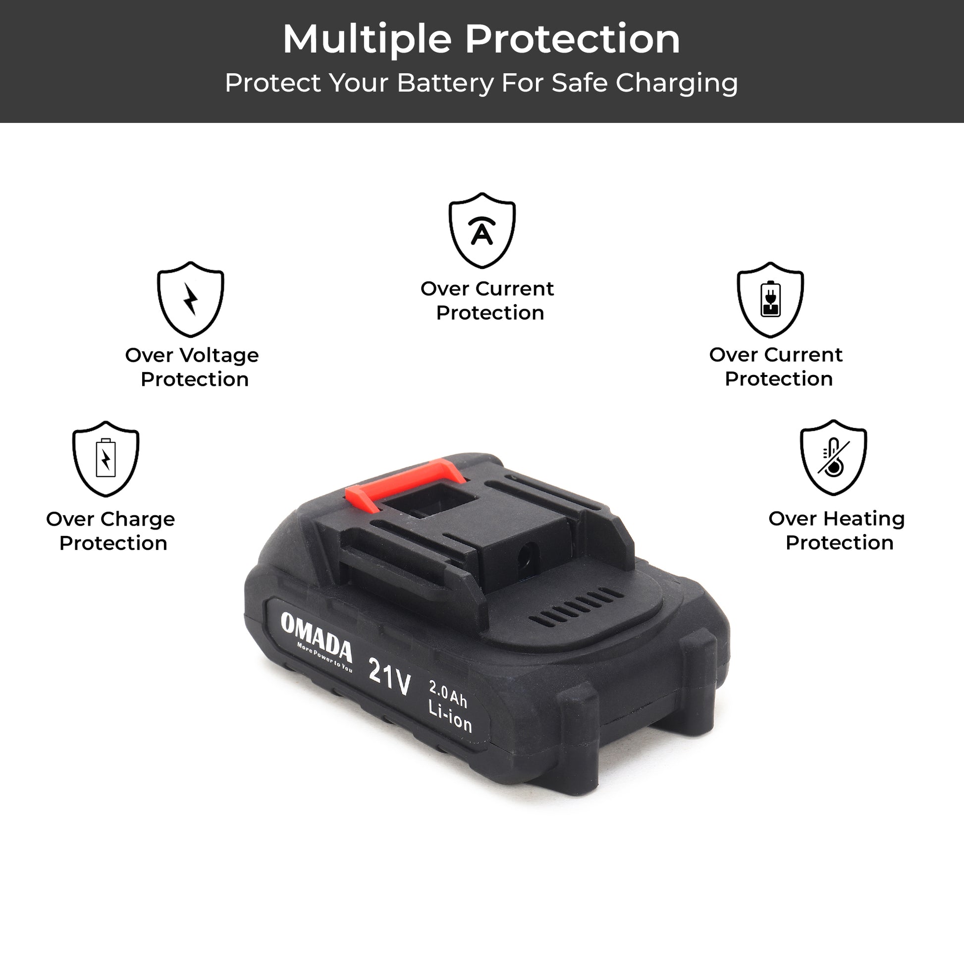 21Volts Max 2.0Ah chargeable replacement battery for Cordless powertools Universal port model. This battery is made of high-quality ABS as raw materials and is made by injection molding. The shape is solid, with high-quality batteries in the middle.